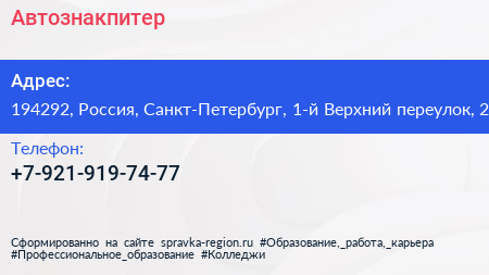 Автознакпитер по адресу 194292, Россия, Санкт-Петербург, 1-й Верхний переулок, 2 в дальнейшем Организация, размещена в следующих категориях: