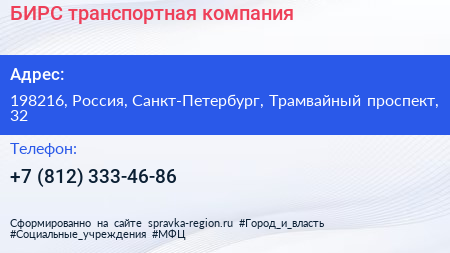 БИРС, транспортная компания по адресу 198216, Россия, Санкт-Петербург, Трамвайный проспект, 32 в дальнейшем Организация, размещена в следующих категориях: