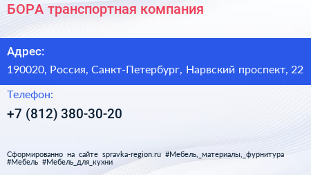 БОРА, транспортная компания по адресу 190020, Россия, Санкт-Петербург, Нарвский проспект, 22 в дальнейшем Организация, размещена в следующих категориях: