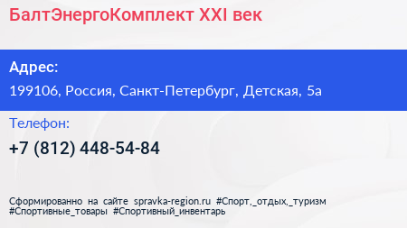 БалтЭнергоКомплект-XXI век по адресу 199106, Россия, Санкт-Петербург, Детская, 5а в дальнейшем Организация, размещена в следующих категориях: