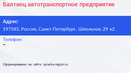 Балтиец, автотранспортное предприятие по адресу 197183, Россия, Санкт-Петербург, Школьная, 29 к2 в дальнейшем Организация, размещена в следующих категориях: