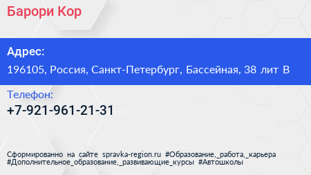 Барори Кор по адресу 196105, Россия, Санкт-Петербург, Бассейная, 38 лит В в дальнейшем Организация, размещена в следующих категориях: