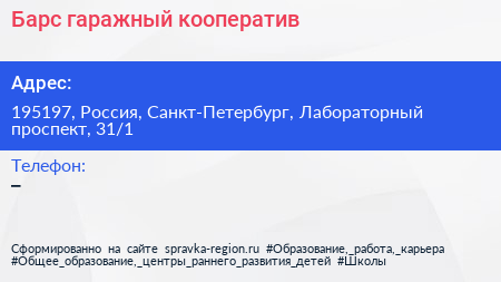 Барс, гаражный кооператив по адресу 195197, Россия, Санкт-Петербург, Лабораторный проспект, 31/1 в дальнейшем Организация, размещена в следующих категориях: