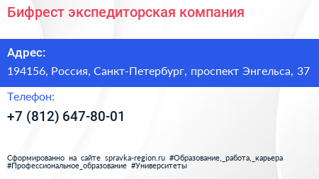 Бифрест, экспедиторская компания по адресу 194156, Россия, Санкт-Петербург, проспект Энгельса, 37 в дальнейшем Организация, размещена в следующих категориях: