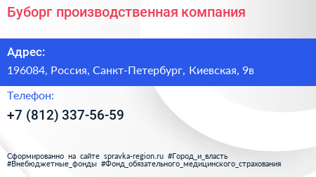 Буборг, производственная компания по адресу 196084, Россия, Санкт-Петербург, Киевская, 9в в дальнейшем Организация, размещена в следующих категориях: