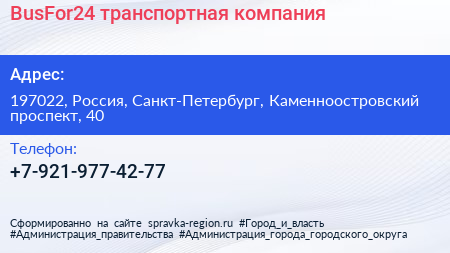 BusFor24, транспортная компания по адресу 197022, Россия, Санкт-Петербург, Каменноостровский проспект, 40 в дальнейшем Организация, размещена в следующих категориях: