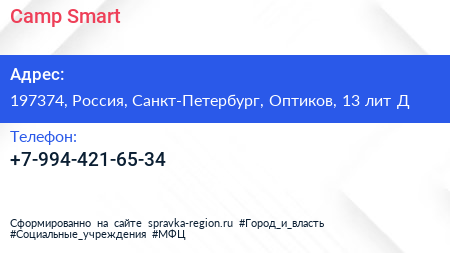 Camp Smart по адресу 197374, Россия, Санкт-Петербург, Оптиков, 13 лит Д в дальнейшем Организация, размещена в следующих категориях: