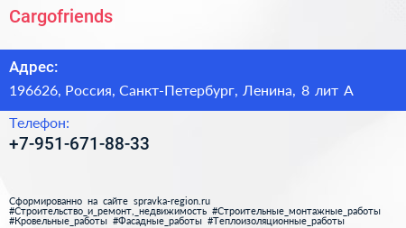 Cargofriends по адресу 196626, Россия, Санкт-Петербург, Ленина, 8 лит А в дальнейшем Организация, размещена в следующих категориях:
