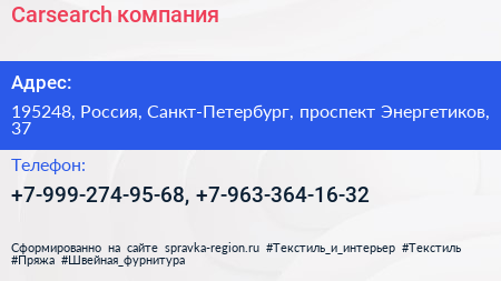 Carsearch, компания по адресу 195248, Россия, Санкт-Петербург, проспект Энергетиков, 37 в дальнейшем Организация, размещена в следующих категориях: