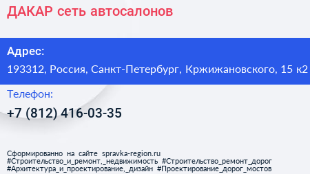 ДАКАР, сеть автосалонов по адресу 193312, Россия, Санкт-Петербург, Кржижановского, 15 к2 в дальнейшем Организация, размещена в следующих категориях: