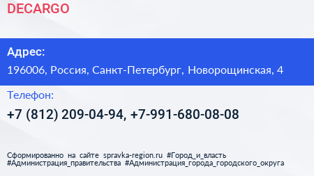 DECARGO по адресу 196006, Россия, Санкт-Петербург, Новорощинская, 4 в дальнейшем Организация, размещена в следующих категориях:
