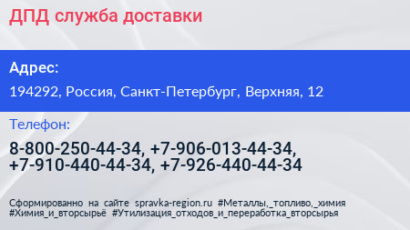 ДПД, служба доставки по адресу 194292, Россия, Санкт-Петербург, Верхняя, 12 в дальнейшем Организация, размещена в следующих категориях: