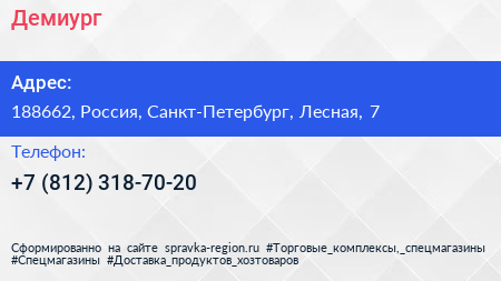 Демиург по адресу 188662, Россия, Санкт-Петербург, Лесная, 7 в дальнейшем Организация, размещена в следующих категориях: