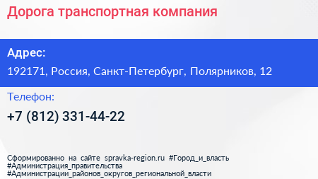 Дорога, транспортная компания по адресу 192171, Россия, Санкт-Петербург, Полярников, 12 в дальнейшем Организация, размещена в следующих категориях: