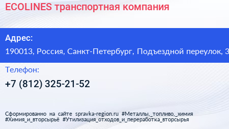 ECOLINES, транспортная компания по адресу 190013, Россия, Санкт-Петербург, Подъездной переулок, 3 в дальнейшем Организация, размещена в следующих категориях: