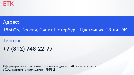 ЕТК по адресу 196006, Россия, Санкт-Петербург, Цветочная, 18 лит Ж в дальнейшем Организация, размещена в следующих категориях: