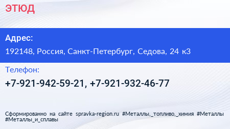 ЭТЮД по адресу 192148, Россия, Санкт-Петербург, Седова, 24 к3 в дальнейшем Организация, размещена в следующих категориях: