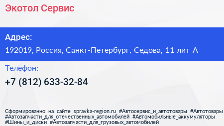 Экотол Сервис по адресу 192019, Россия, Санкт-Петербург, Седова, 11 лит А в дальнейшем Организация, размещена в следующих категориях: