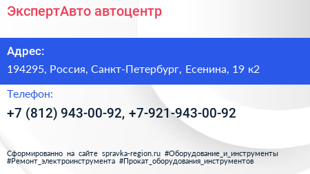 ЭкспертАвто, автоцентр по адресу 194295, Россия, Санкт-Петербург, Есенина, 19 к2 в дальнейшем Организация, размещена в следующих категориях: