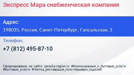 Экспресс Мара, снабженческая компания по адресу 198035, Россия, Санкт-Петербург, Гапсальская, 3 в дальнейшем Организация, размещена в следующих категориях: