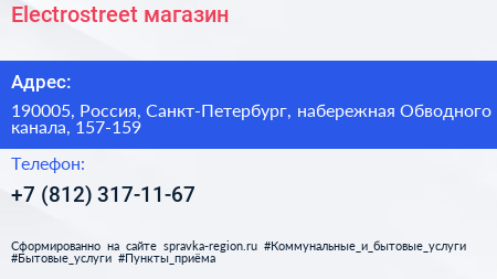 Electrostreet, магазин по адресу 190005, Россия, Санкт-Петербург, набережная Обводного канала, 157-159 в дальнейшем Организация, размещена в следующих категориях: