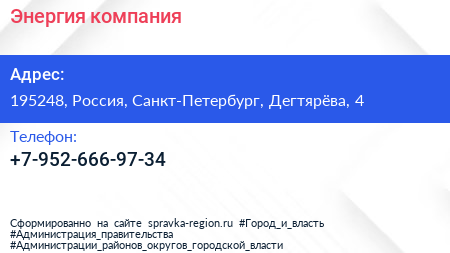 Энергия, компания по адресу 195248, Россия, Санкт-Петербург, Дегтярёва, 4 в дальнейшем Организация, размещена в следующих категориях: