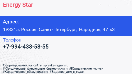 Energy Star по адресу 193315, Россия, Санкт-Петербург, Народная, 47 к3 в дальнейшем Организация, размещена в следующих категориях:
