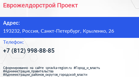 Еврожелдорстрой-Проект по адресу 193232, Россия, Санкт-Петербург, Крыленко, 26 в дальнейшем Организация, размещена в следующих категориях: