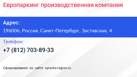 Европаркинг, производственная компания по адресу 196006, Россия, Санкт-Петербург, Заставская, 4 в дальнейшем Организация, размещена в следующих категориях: