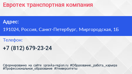 Евротек, транспортная компания по адресу 191024, Россия, Санкт-Петербург, Миргородская, 1Б в дальнейшем Организация, размещена в следующих категориях: