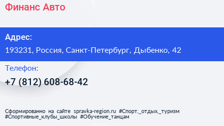 Финанс Авто по адресу 193231, Россия, Санкт-Петербург, Дыбенко, 42 в дальнейшем Организация, размещена в следующих категориях: