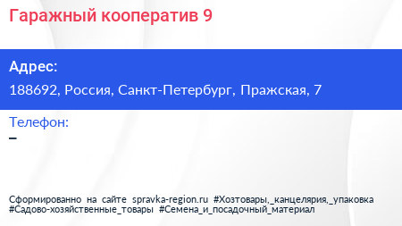 Гаражный кооператив №9 по адресу 188692, Россия, Санкт-Петербург, Пражская, 7 в дальнейшем Организация, размещена в следующих категориях: