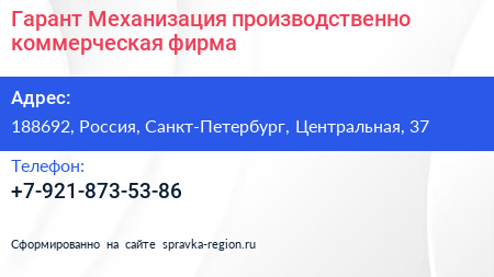 Гарант Механизация, производственно-коммерческая фирма по адресу 188692, Россия, Санкт-Петербург, Центральная, 37 в дальнейшем Организация, размещена в следующих категориях:
