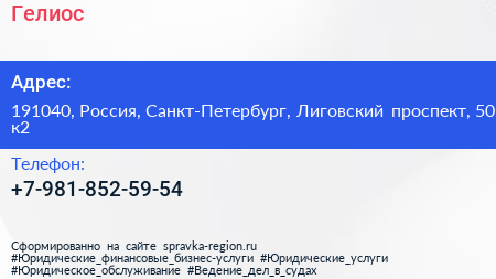 Гелиос по адресу 191040, Россия, Санкт-Петербург, Лиговский проспект, 50 к2 в дальнейшем Организация, размещена в следующих категориях:
