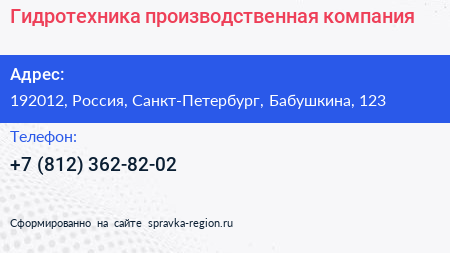 Гидротехника, производственная компания по адресу 192012, Россия, Санкт-Петербург, Бабушкина, 123 в дальнейшем Организация, размещена в следующих категориях: