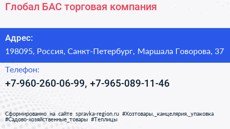 Глобал БАС, торговая компания по адресу 198095, Россия, Санкт-Петербург, Маршала Говорова, 37 в дальнейшем Организация, размещена в следующих категориях: