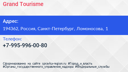 Grand Tourisme по адресу 194362, Россия, Санкт-Петербург, Ломоносова, 1 в дальнейшем Организация, размещена в следующих категориях: