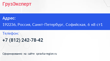 ГрузЭксперт по адресу 192236, Россия, Санкт-Петербург, Софийская, 6 к8 ст1 в дальнейшем Организация, размещена в следующих категориях: