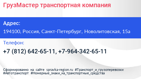 ГрузМастер, транспортная компания по адресу 194100, Россия, Санкт-Петербург, Новолитовская, 15а в дальнейшем Организация, размещена в следующих категориях: