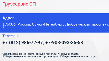 Грузсервис СП по адресу 196006, Россия, Санкт-Петербург, Люботинский проспект, 5 в дальнейшем Организация, размещена в следующих категориях: