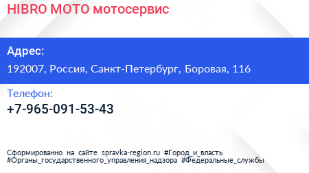 HIBRO MOTO, мотосервис по адресу 192007, Россия, Санкт-Петербург, Боровая, 116 в дальнейшем Организация, размещена в следующих категориях: