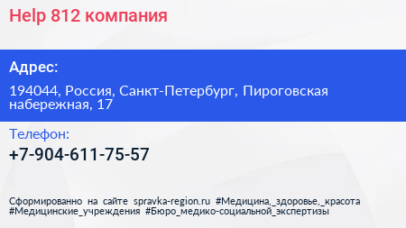 Help-812, компания по адресу 194044, Россия, Санкт-Петербург, Пироговская набережная, 17 в дальнейшем Организация, размещена в следующих категориях: