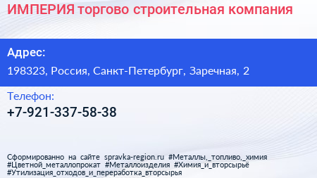 ИМПЕРИЯ, торгово-строительная компания по адресу 198323, Россия, Санкт-Петербург, Заречная, 2 в дальнейшем Организация, размещена в следующих категориях: