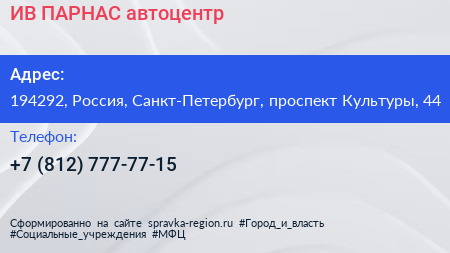 ИВ-ПАРНАС, автоцентр по адресу 194292, Россия, Санкт-Петербург, проспект Культуры, 44 в дальнейшем Организация, размещена в следующих категориях: