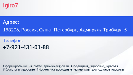 Igiro7 по адресу 198206, Россия, Санкт-Петербург, Адмирала Трибуца, 5 в дальнейшем Организация, размещена в следующих категориях: