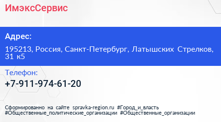 ИмэксСервис по адресу 195213, Россия, Санкт-Петербург, Латышских Стрелков, 31 к5 в дальнейшем Организация, размещена в следующих категориях:
