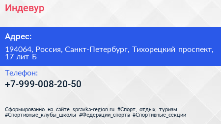 Индевур по адресу 194064, Россия, Санкт-Петербург, Тихорецкий проспект, 17 лит Б в дальнейшем Организация, размещена в следующих категориях: