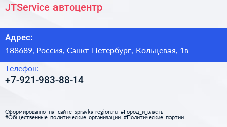 JTService, автоцентр по адресу 188689, Россия, Санкт-Петербург, Кольцевая, 1в в дальнейшем Организация, размещена в следующих категориях:
