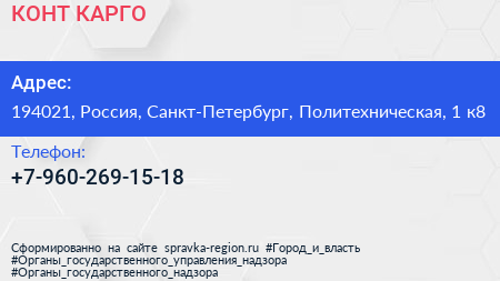 КОНТ-КАРГО по адресу 194021, Россия, Санкт-Петербург, Политехническая, 1 к8 в дальнейшем Организация, размещена в следующих категориях: