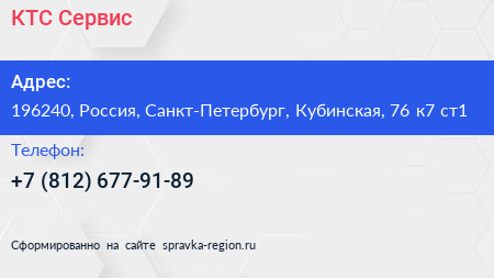 КТС-Сервис по адресу 196240, Россия, Санкт-Петербург, Кубинская, 76 к7 ст1 в дальнейшем Организация, размещена в следующих категориях: